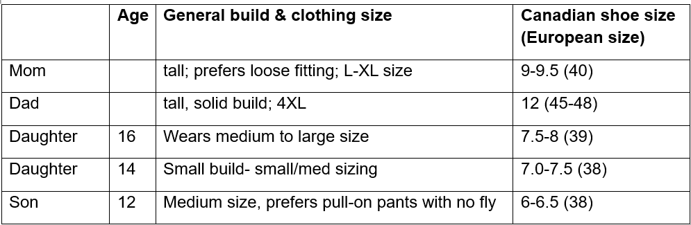 They need shirts, pants, shorts, coats (winter and spring), raincoats, hoodies, sweaters, track shoes, good shoes, boots. Any clothing for mom or the girls must have long sleeves.